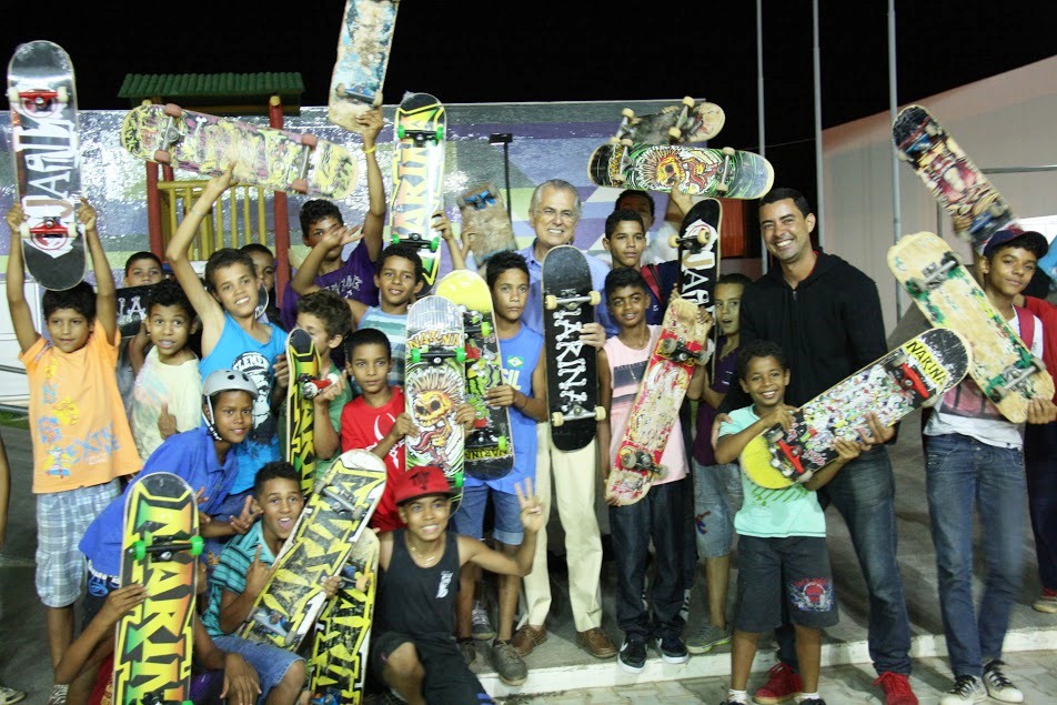 O prefeito Humberto Santa Cruz participou na noite de ontem, quarta-feira, 1º de abril, no Centro de Esportes e Artes Unificados (CEUs) do bairro Santa Cruz, da entrega de dez skates e dez capacetes para os alunos do projeto de inclusão social através do esporte da secretaria de Trabalho e Assistência Social. Participaram da entrega a secretária da pasta, Maira de Andrada Santa Cruz e o instrutor de skate Henderson Aires.