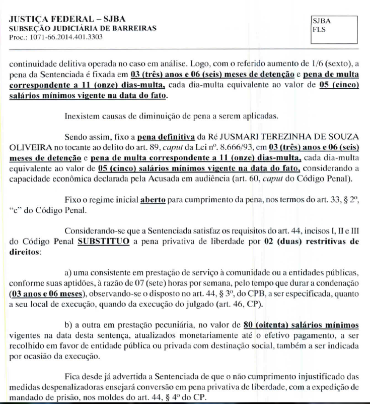 A pena na sentença prolatada pela juíza federal Gabriela Silva Macedo, da subseção judiciária de Barreiras, em 3 de março deste ano: