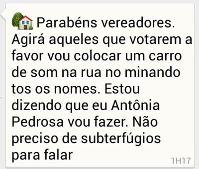 Antonia Pedrosa, ex-deputada e primeira dama de Barreiras, não é conhecida pela sua timidez. No whatsapp, diz que vai botar o samba na rua, nominando os vereadores que votarem contra a rejeição das contas da ex-prefeita Jusmari Oliveira. Quando “La Pedrosa”, a Passionária, afirma que vai fazer, pode escrever que ela faz. O print da mensagem de Pedrosa é do editor Fernando Machado, do ZDA.