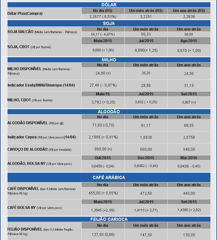 Cotações agrícolas deste dia 16, no Oeste, fornecidas pela AIBA