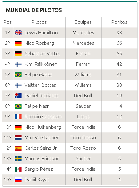 Como resultado, o brasileiro perdeu a quarta posição no campeonato para Kimi Raikkonen, que foi segundo com a Ferrari. O brasileiro agora tem 31 pontos, um a mais que o companheiro Valtteri Bottas, que correu sozinho até as 20 voltas finais, quando Sebastian Vettel teve de trocar o bico de sua Ferrari e voltou em quinto, atrás do finlandês da Williams. Apesar da pressão, Bottas manteve a posição.