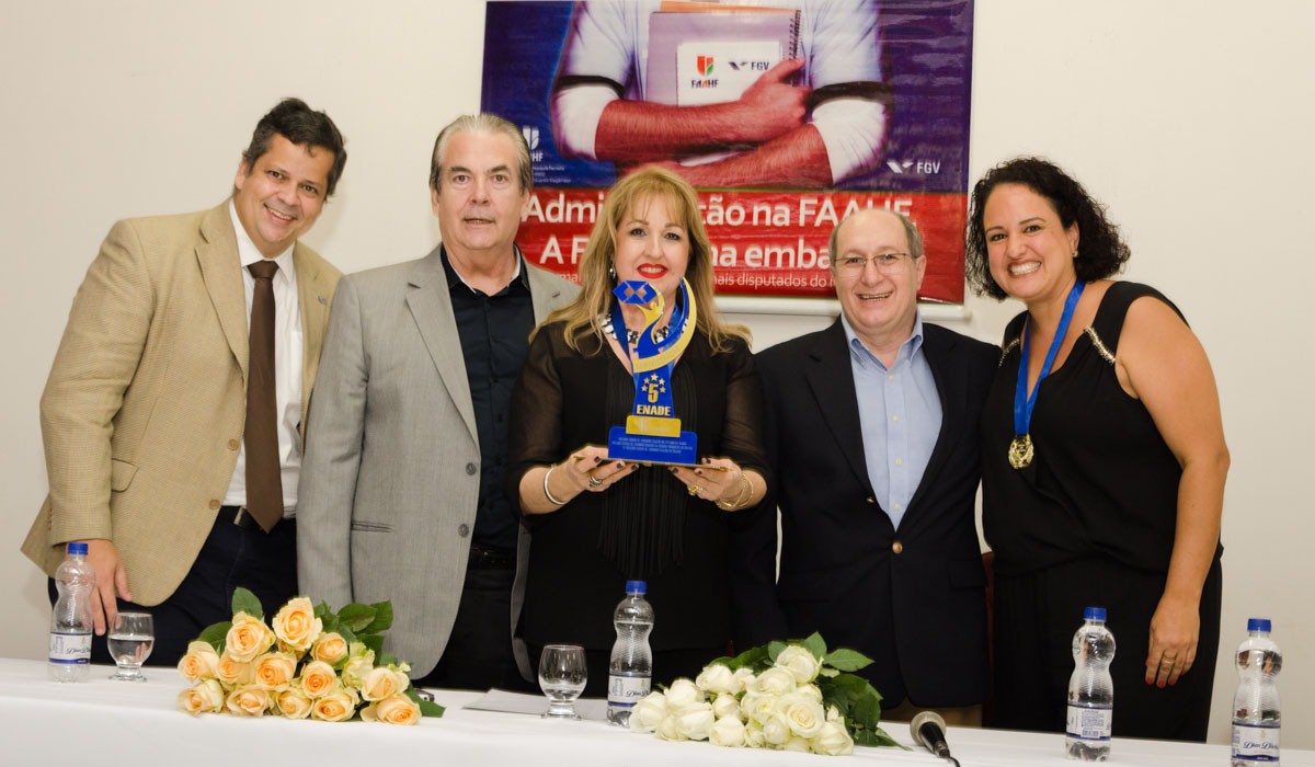 Ao fim da entrega da Certificação FGV a todos os administradores a Coordenadora do Curso de Administração da FAAHF, professora Andréa Elisa Silva Bernardes, recebeu das mãos da Diretora Geral da FAAHF, Maria Angélica Cardoso Ferreira de Sousa, o troféu Nota 5 – ENADE 2012 – Curso de Administração e em seguida foi realizado um coquetel de confraternização, no Centro de Convenções da FAAHF.