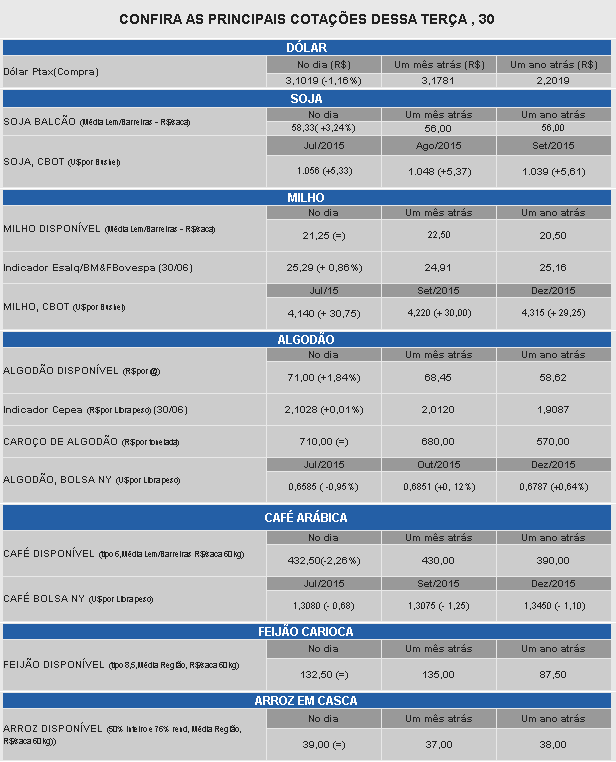 Principais cotações agrícolas desta terça, compiladas pela AIBA