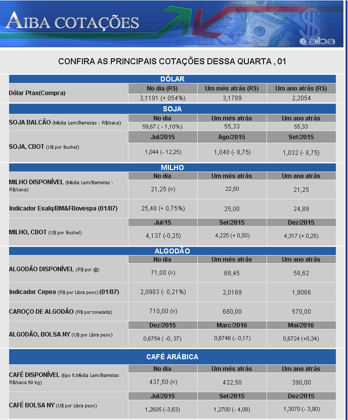 Cotações de produtos agrícolas, coletadas pela AIBA