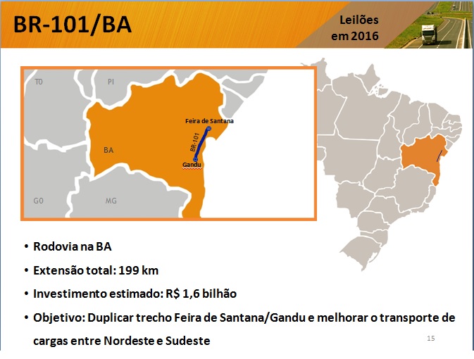 Na Bahia, o PIL inclui a concessão de 199 km da BR-101, entre Feira de Santana e Gandu, que prevê a duplicação da rodovia e melhoria do transporte de cargas. O investimento previsto é de R$ 1,6 bilhão. Nas concessões já existentes, estão em fase de negociação com as concessionárias investimentos de R$ 400 milhões para construção de uma faixa adicional em trecho da BR-324/116 na Bahia.