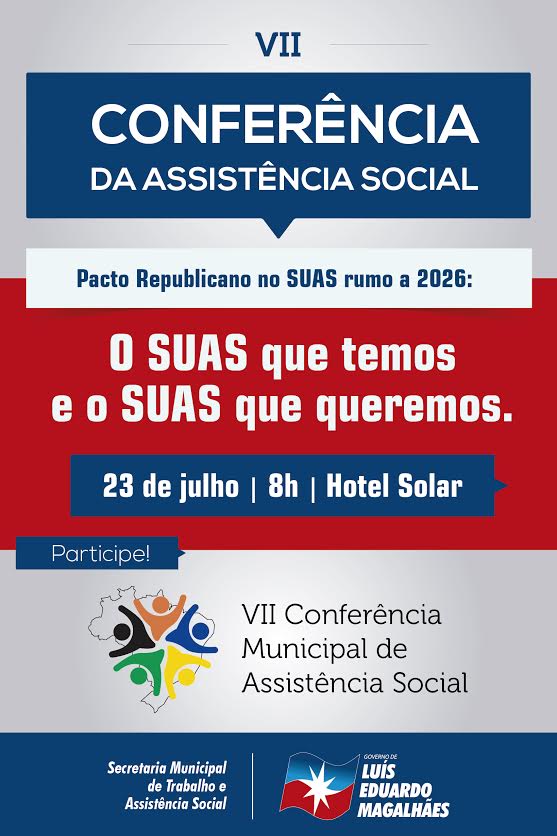 A Secretaria de Trabalho e Assistência Social de Luís Eduardo Magalhães realiza nesta quinta-feira, 23, no Hotel Solar Rio de Pedras a VII Conferência Municipal de Assistência Social sobre o tema “O SUAS que temos e o SUAS que queremos”. O credenciamento está previsto para as 7h30 e a conferência para as 8h.
