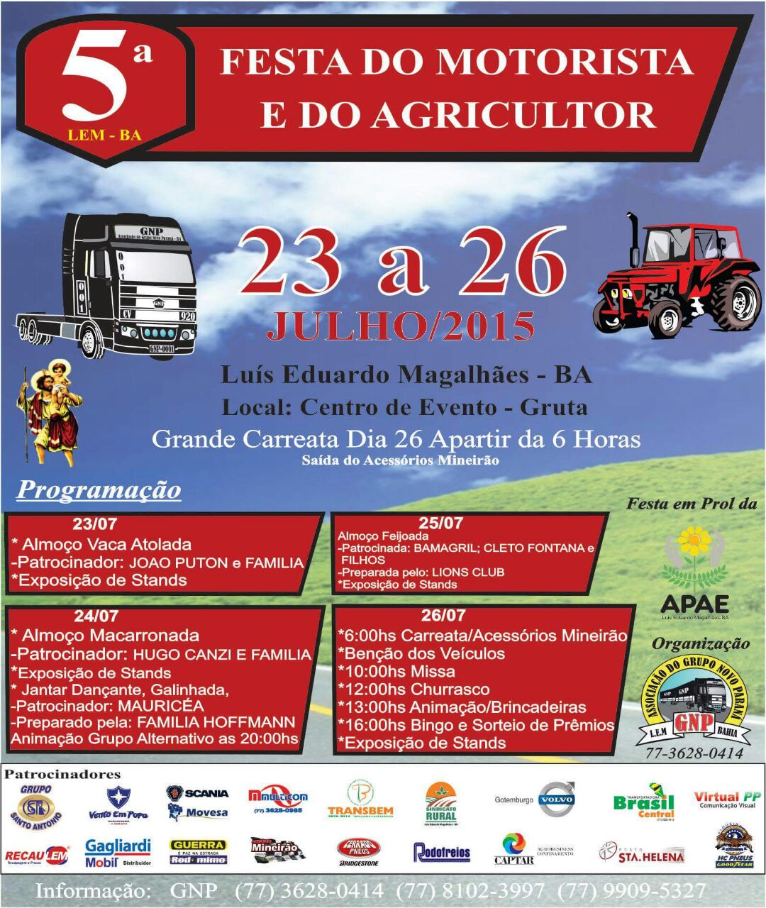 Dona Ida Barcellos avisa: hoje o prato do dia é macarronada na gruta, em comemoração ao Dia do Motorista e do Agricultor, com promoção beneficente da APAE/LEM. À noite, será servido risoto.