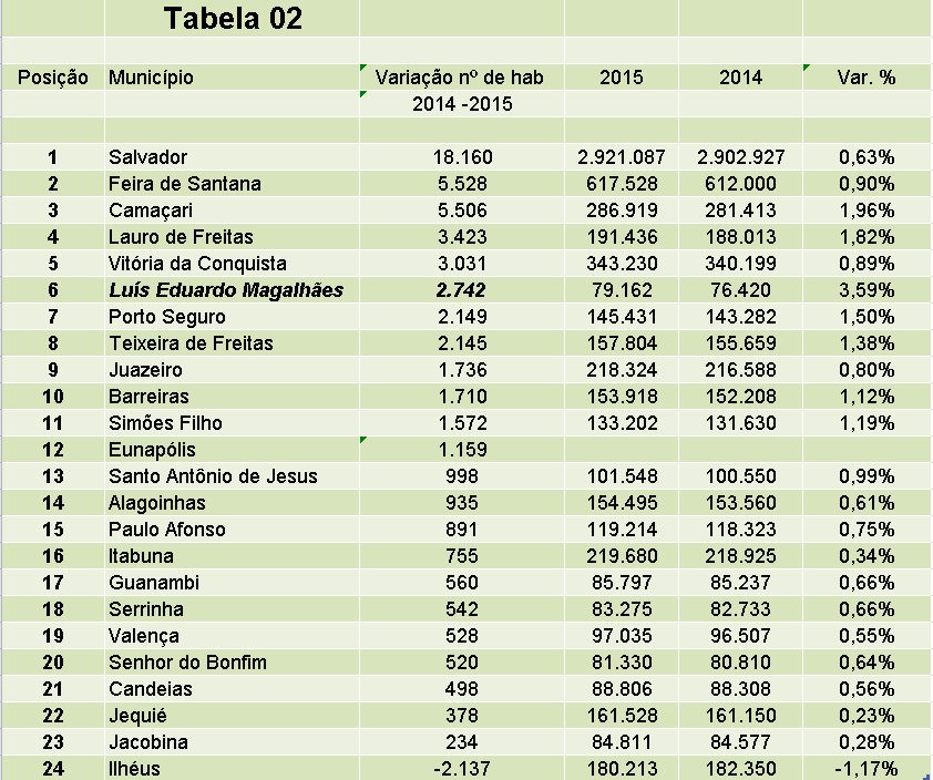 Também em números absolutos de crescimento da população, Luís Eduardo está bem colocado: segundo o IBGE, ganhou 2.752 habitantes no último ano, sendo o sexto colocado em crescimento de habitantes e o quinto no interior do Estado. ( Veja na tabela 02)