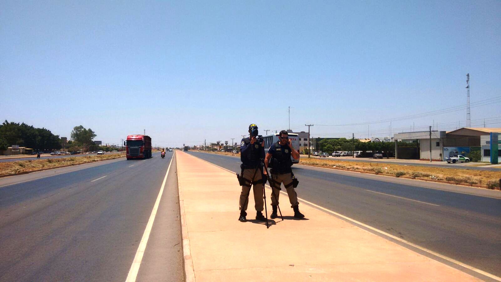 Os agentes Gontijo e Gilberto surpreenderam os amantes da velocidade na BR 242, próximo às instalações da Galvani, agora pela manhã. Em uma hora, aplicaram 30 multas nos apressadinhos. A velocidade permitida no trecho é de 60 km/h.