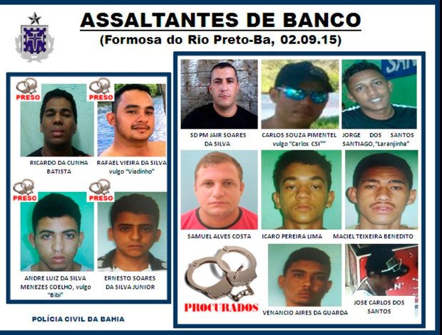 Além do policial militar, já estão presos André Luiz da Silva Menezes Coelho, o “Bibi”, 24, e Ernesto Soares da Silva Junior, 29, capturados pela polícia do Piauí, logo depois do assalto a uma agência dos Correios, naquele estado. Rafael Vieira da Silva, 26 anos, preso, na terça-feira (29), na cidade de Baianópolis, Ricardo da Cunha Batista, 36, capturado na quarta-feira (30), em Valparaíso, no estado de Goiás, e Venâncio Aires da Guarda Neto, 20, localizado no município de Luís Eduardo Magalhães.