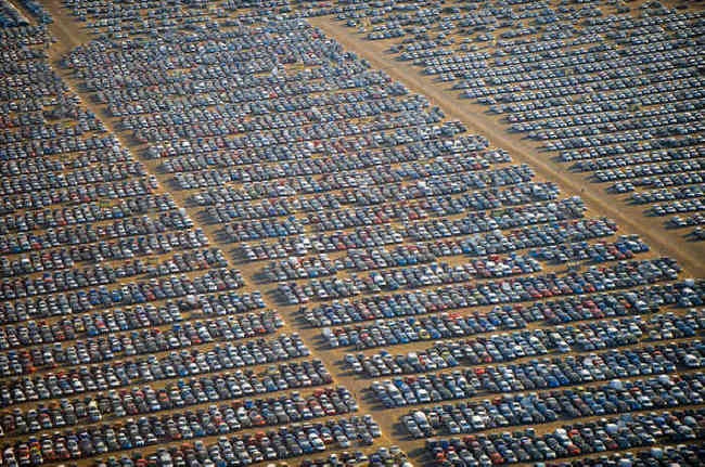 Retrato do capitalismo em crise: renda dos trabalhadores despenca; carros sobram, às dezenas de milhares, em pátios que denunciam lógica insensata do sistema