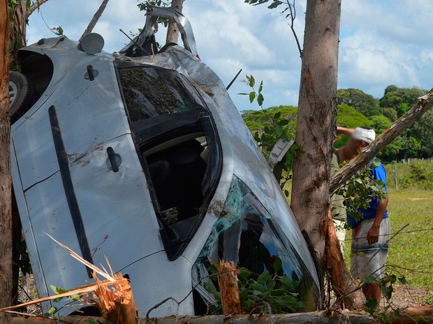 Um carro de passeio que seguia pela BA-489, entre as cidades de Prado e Itamaraju, na região sul da Bahia, saiu da pista e bateu em árvores à margem da rodovia. O veículo ficou preso entre os troncos.