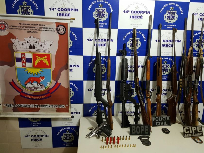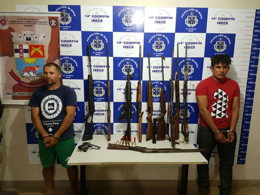 Com Flaldemir foram encontradas uma pistola calibre 765, quatro espingardas calibre 28,16 e 36, três carabinas, um simulacro de fuzil e uma luneta. Já com Damião, um rifle calibre 44 e dez cartuchos foram apreendidos. A dupla foi encaminhada para a 14ª Coordenadoria de Polícia do Interior (Irecê) onde é ouvida pelo delegado titular Roberto Leal.
