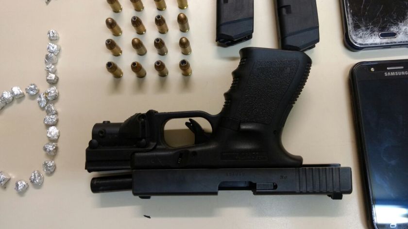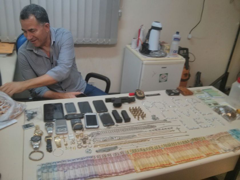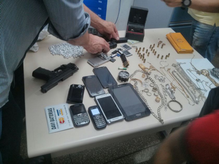 Ao cumprir mandado judicial de prisão temporária, os policiais encontraram uma arma de fogo, tipo pistola cal. 380, marca Glock com mira laser, uma quantidade de 222, pedras de crack, prontas pra venda, vários relógios, correntes , anéis de todos tipo, vários celulares, balança de precisão, moedor de drogas, máquina fotográfica, uma quantia em dinheiro de quase R$1.800,00; além de um documento de uma motocicleta usada em vários homicídios recentemente e apreendida na semana passada na posse de um matador de aluguel.
