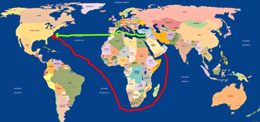 Na rota vermelha, por onde passam hoje os petroleiros com o óleo saudita em direção ao maior consumidor do mundo, os Estados Unidos, responsável por 40% de toda a energia consumida na Terra. Na rota verde um oleoduto leva o petróleo até portos da Síria, onde é embarcado para os Estados Unidos.