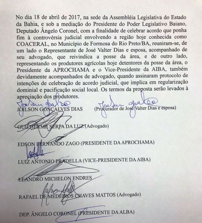 Um amplo acordo entre José Valter Dias, que se dizia proprietário das áreas da Coaceral e Aprochama, e estava de posse de um mandado de reintegração de posse, exarado do juiz titular da Comarca de Formosa do Rio Preto, custará aos mais de 300 produtores, que plantam na área de 320.000 hectares, a bagatela de R$ 398.000.000,00 – trezentos e noventa e oito milhões de reais.