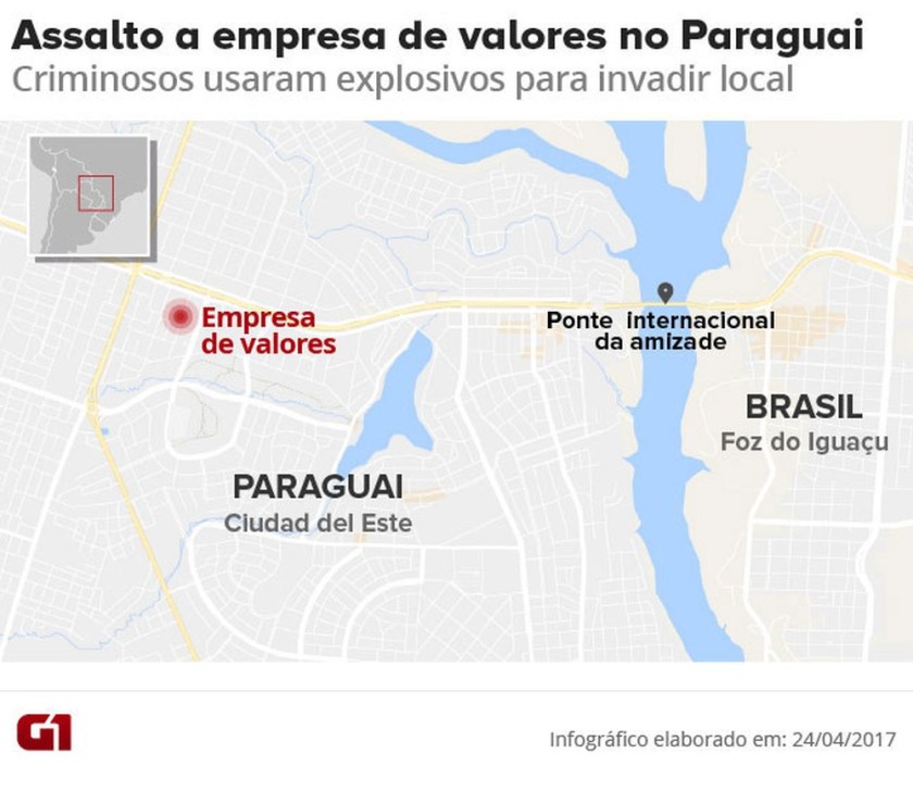 Segundo a Polícia Nacional do Paraguai, cerca de 50 ladrões fortemente armados invadiram a sede da transportadora de valores Prosegur em Ciudad del Este, no Paraguai, durante a madrugada desta segunda-feira (24), e fugiram com dinheiro. Inicialmente, a Polícia Nacional do Paraguai informou que o grupo havia fugido com US$ 40 milhões (o equivalente a mais de R$ 120 milhões). Mais tarde, a própria polícia informou que os valores ainda estão sendo contabilizados.