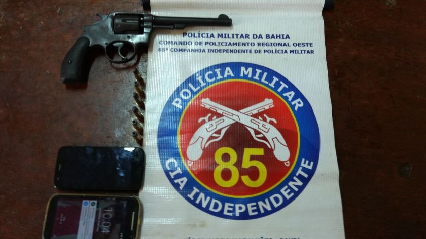 Após a realização de busca pessoal e averiguação do local, foi encontrado uma arma de fogo, de marca não identificada, calibre 38, municiada com 06 cartuchos intactos. Todos os elementos, J.A.B., P.J.P.S. e D.S.C., são menores de idade. Eles foram apreendidos e apresentados na Delegacia de Polícia.