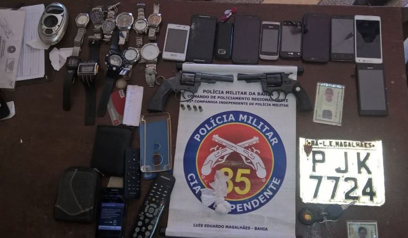 Na referida residência havia 4 pessoas (03 homens e 01 mulher). Ao fazer buscas conjuntas foram localizadas 02 armas de fogo, tipo revólver, ambos calibre 32 municiados. Foi localizada uma trouxa de substância aparentando ser cocaína, totalizando 19 gramas. Além de diversos celulares e relógios de marcas variadas, carteiras de bolso, TV e aparelho de Som.