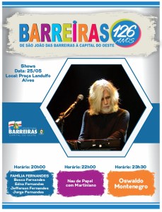 Oswaldo Montenegro entrará no Palco as 23:30h, para comemorar a passagem para o dia 26, encantando os barreirenses. Em sua bagagem, traz a mistura de peso das guitarras, teclados, baixo e bateria com o som melodioso da flauta, e apresentará o show da turnê “Nossas Histórias” tocando suas músicas mais conhecidas em parceria com a flautista Madalena Salles, que o acompanha há 40 anos.
