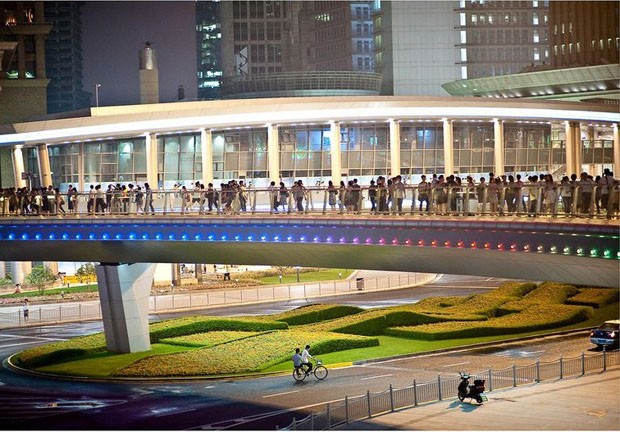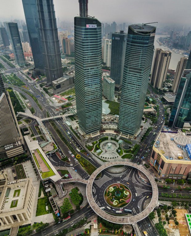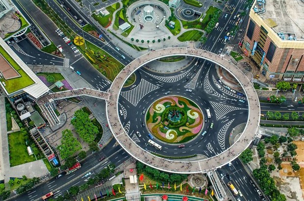 Mas não no bairro de Pudong, em Xangai, na China. Ali, os pedestres ganharam uma rotatória só para eles: a passarela circular Lujiazui, construída do lado leste do rio Huangpu, na zona econômica e financeira da cidade, cercada por arranha-céus onde não havia nada além de terra há 15 anos.