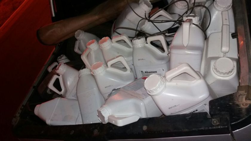 Segundo informes chegados agora, perto das 21 horas, a mesma força conjunta de policiais civis e militares, cumpriu uma segunda missão na tarde de hoje, em um aglomerado de casas também na região do Cerradão. Ao chegarem ao local, ainda conseguiram ver uma dupla de ladrões em fuga rumo a um matagal. Dando buscas no local encontraram dois veículos, um VW Kombi, um Chevrolet Celta e uma boa quantidade do inseticida e acaricida ABAMEX sem documentos de identificação de origem e acobertamento fiscal, além de um GPS da marca Stara.