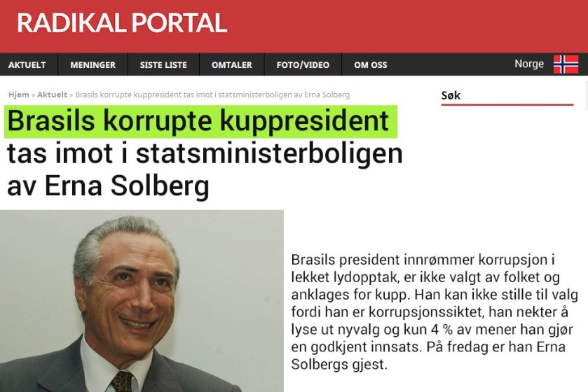 O texto fala algo assim: Acusado de golpe admitiu que é acusado de corrupção por conta de um audio que vazou. Convidado de Erna Solberg nesta sexta feira, ele não defende eleiçoes diretas agora, porque tem apenas 4% em média de aprovação.