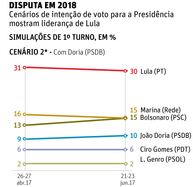 O ex-presidente Lula (PT) segue liderando os cenários em pesquisa de intenções de voto realizada pelo Datafolha, com 29% a 30%, sendo seguido por Marina Silva (Rede) e Jair Bolsonaro (PSC). A pesquisa é da Folha de São Paulo, onde o leitor poderá encontrar vários cenários.