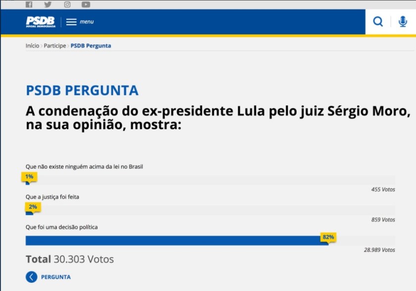 O tucanato, que hoje oscila perigosamente entre a continuidade do Governo Michel Temer e o apoio ao afastamento do presidente, teve uma amarga experiência no dia de hoje. Depois de colocar uma enquete em seu site oficial, sobre a condenação de Lula da Silva, conheceu um pouco do pensamento do eleitor da maneira mais risível:
