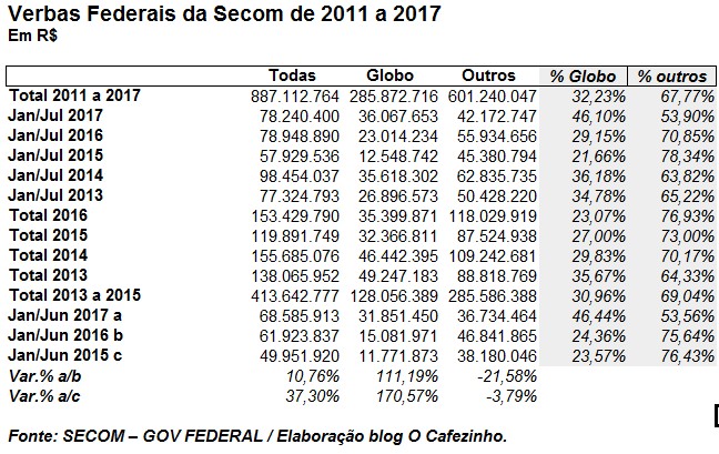 O percentual da Globo no total das verbas da Secom em 2017 já está em 46%. Em 2015, ela foi de 22% e já havia crescido para 29% em 2016. O conteúdo foi compilado pelo site O Cafezinho e editado pelo Sul 21.