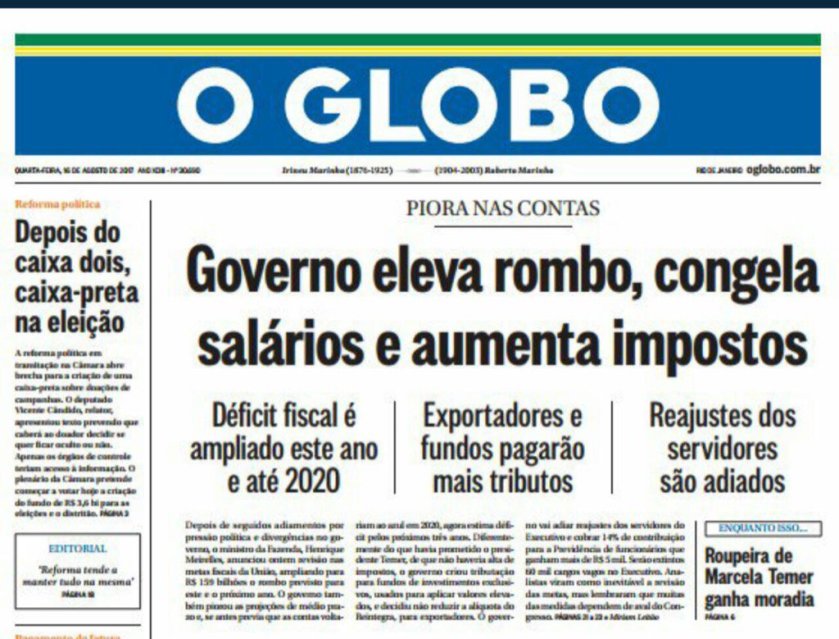 Engraçado, não morro de amores pelo temer mais sejamos justos, o temer pegou o país destruído pela Dilma (anta) e PT e agora tudo cai nas costas do cara, ele é o menor dos culpados pelo pais tá desse jeito ou vc acha que tudo ferrou do dia pra noite. Isso vem de muitos anos de adm ruim, a galera esquece q até pouco tempo era a Anta que estava no poder. O expresso tem que publicar a informação e os leitores opinarem não já opinar no titulo da matéria.