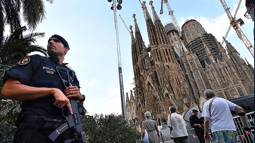 Um policial da Catalunha faz segurança na Basílica da Sagrada Família, em Barcelona, durante a missa em memória das vítimas de terrorismo.