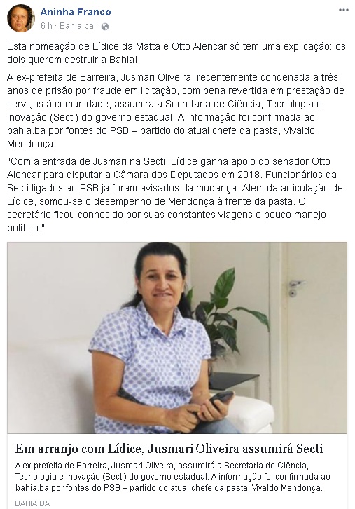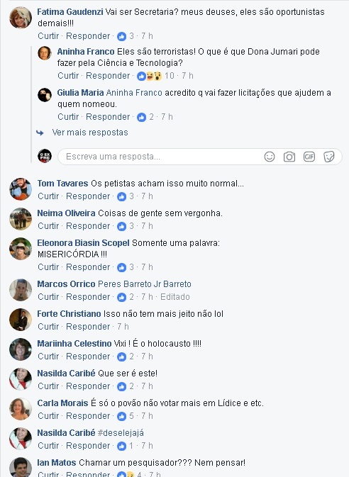Uma internauta da Capital, Aninha Franco, escritora e com um grande número de seguidores, compartilhou um link com a notícia da nomeação de Jusmari. A reação foi grande.