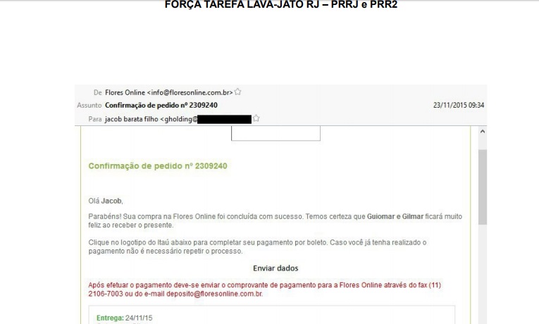Autorizado pelo juiz Marcelo Bretas, da 7ª Vara Federal do Rio, o MPF vasculhou e encontrou na caixa de e-mail de Jacob Barata Filho uma confirmação de pedido de entrega de flores para Gilmar Mendes e a mulher, Guiomar. Esse pedido foi feito em 23 de novembro de 2015.