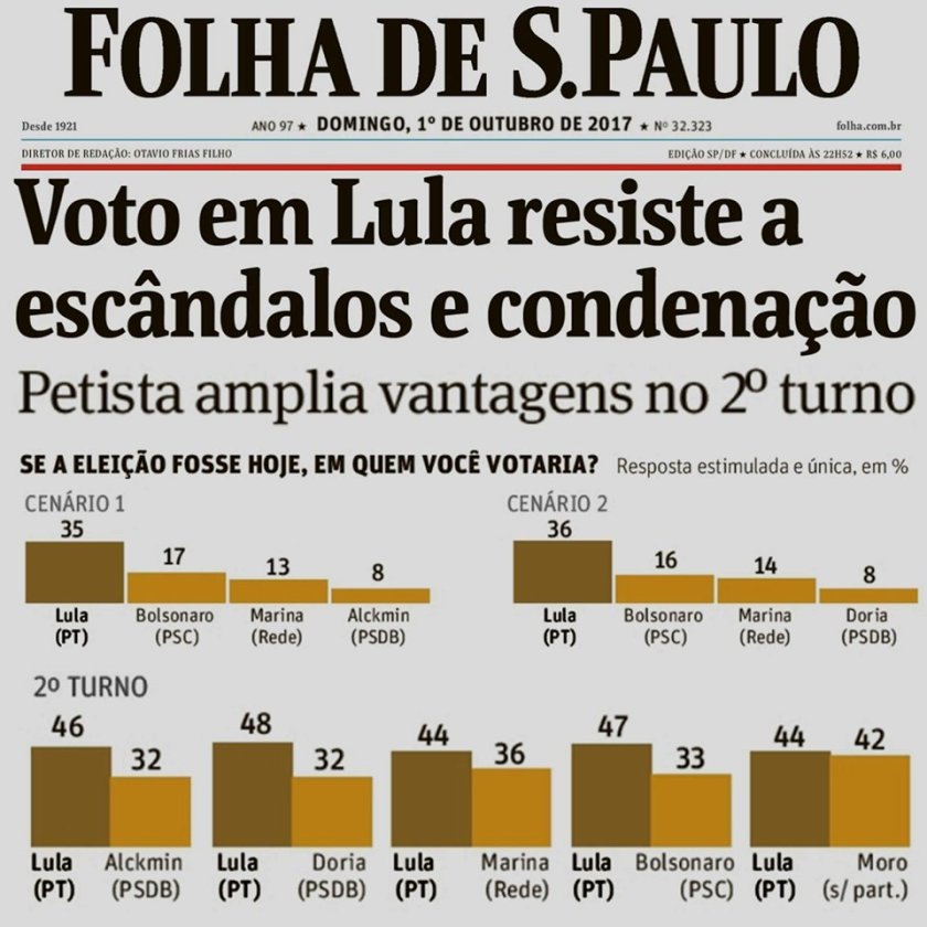 1. Em oura pesquisa divulgada pelo mesmo jornal Folha de São Paulo 54% dos entrevistados acham que Lula deve ser preso pela série de crimes cometidos. Já contra Temer 89% dos entrevistados querem a abertura de processo contra ele por organização criminosa e obstrução de justiça.