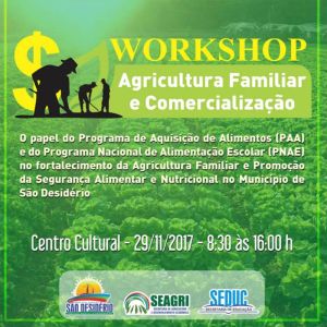 A prefeitura de São Desidério por meio da Secretaria de Agricultura e Desenvolvimento Econômico (SEAGRI) em parceria com a Secretaria de Educação (SEDUC) promove o 1º Workshop da Agricultura Familiar e Comercialização amanhã, 29, no Centro Cultural.