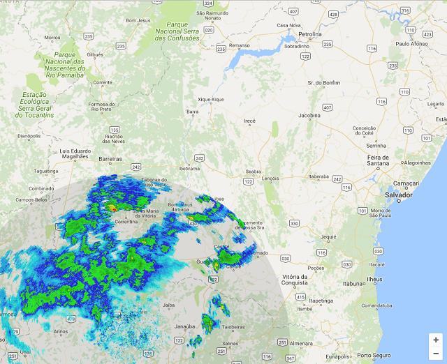 O radar meteorológico de São Francisco (MG), da Aeronáutica, detectou vários núcleos de chuva de moderada até forte intensidade sobre municípios do oeste da Bahia durante esta quinta-feira (30).