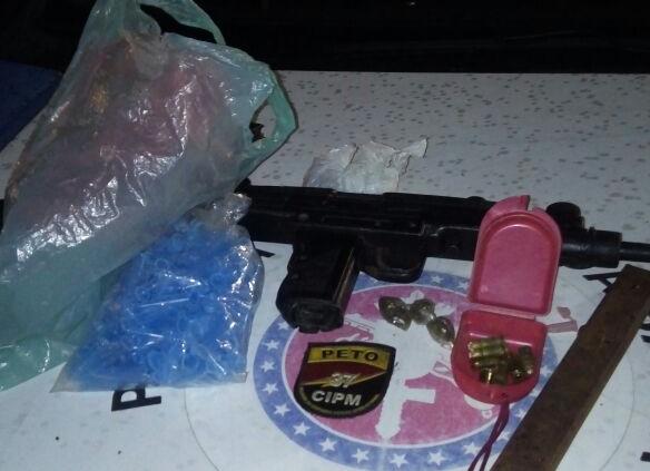 Os militares notaram a presença de aproximadamente cinco homens vendendo drogas e fizeram a aproximação. O grupo correu e deixou para trás, além da arma, dois carregadores, munições de calibre 9mm, 13 trouxas de maconha, um caderno com anotações das vendas e um saco com pinos plásticos utilizados para embalar cocaína.