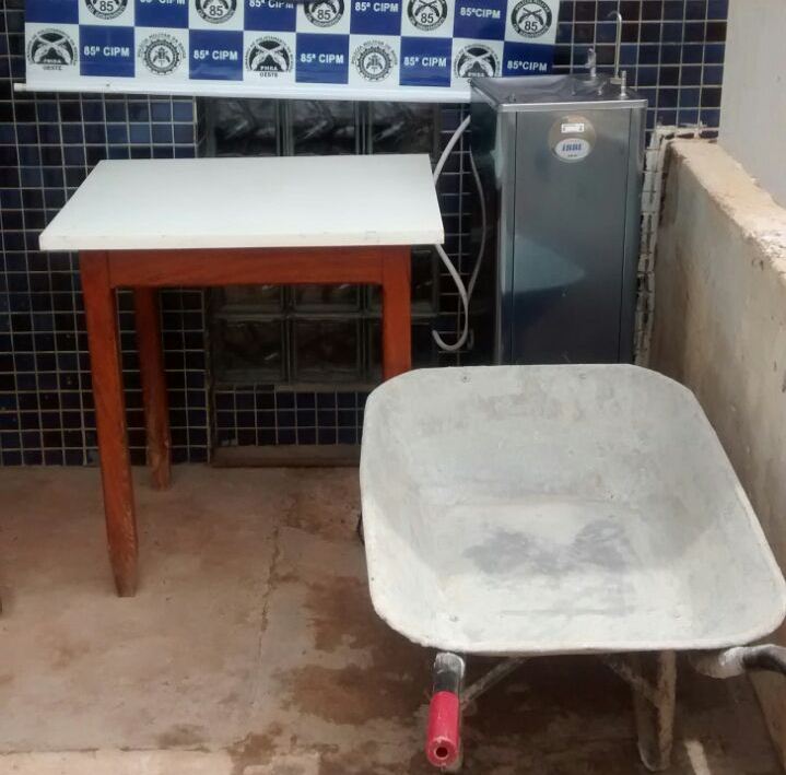 Entre os objetos roubados, uma mesa, um bebedouro e um carrinho de mão.