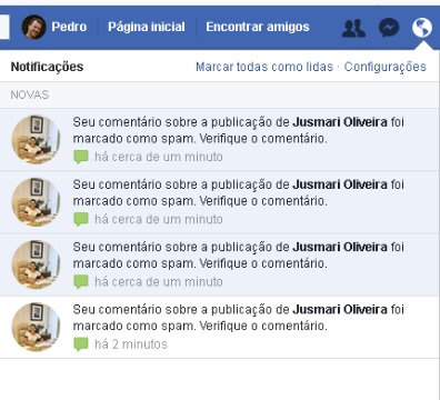 Os comentários foram denunciados à administração do Facebook como “spam”. Veja a imagem da página do internauta: