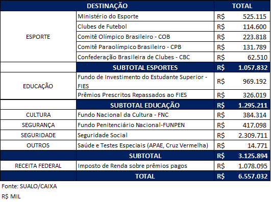Segundo a vice-presidente de Fundos de Governo e Loterias da CAIXA, Deusdina dos Reis Pereira, 2017 foi um ano particularmente marcado por oportunidades e desafios, terminando com o sucesso da Mega da Virada. “Só o concurso especial distribuiu mais de R$ 431 milhões a 178 mil apostas. No ano, as Loterias CAIXA ofertaram em prêmios mais de R$ 4,2 bilhões, consolidando o papel social das Loterias no Brasil, que além de serem peça fundamental na estratégia de crescimento e manutenção das políticas públicas do país, oportunizam a realização de sonhos dos apostadores, por meio dos prêmios milionários”, afirmou Deusdina. Concursos Especiais: Repasses Sociais: |