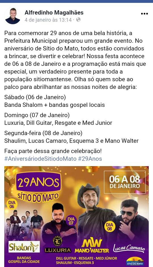 Desde domingo o município de Sítio do Mato está em festas pelo 29º ano de sua emancipação.
