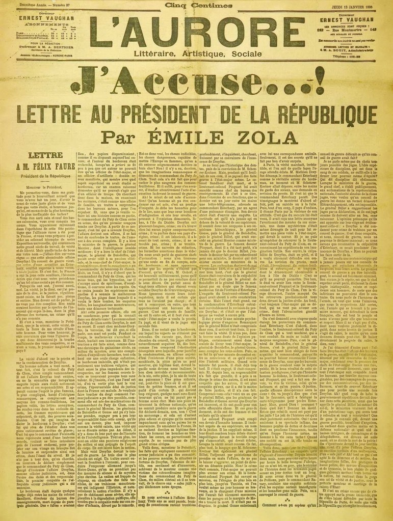 13 de janeiro de 1898. O escritor francês Émile Zola publicou uma carta com o título J’Accuse, em que acusava o governo de francês de encobrir a verdade no caso Dreyfus. O capitão Alfred Dreyfus, de origem judaica, tinha sido acusado de espionagem a favor da Alemanha, condenado e deportado para a Guiana Francesa. Devido à carta que provocou a reabertura do processo, Dreyfus foi ilibado e reintegrado no exército francês.