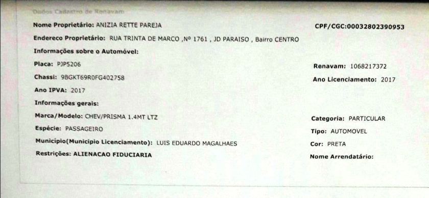 Os ladrões levaram seu carro, um Chevrolet Prisma, placas PJP 5206, ano 2017, de cor preta. Na hora do assalto, os ladrões bateram o carro e arrancaram um dos retrovisores.