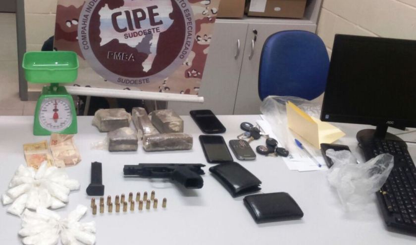As forças da CIPE Sudoeste apreenderam, ontem à noite, em Vitória da Conquista, uma grande quantidade de drogas e armas, a partir de um fato inusitado. Por volta das 21 horas, a direção do Conjunto Penal da cidade flagrou, através de câmeras de vídeo, uma agente penitenciário de uma empresa privada, deixando cair do bolso do blusão uma embalagem, depois de ser avisado por outro agente de que o scanner de acesso estava funcionando.
