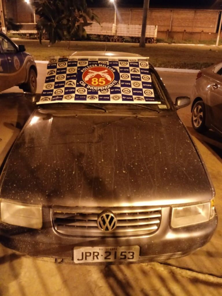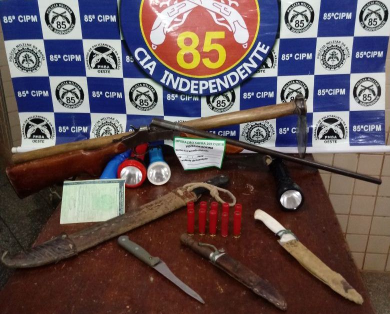 Policiais militares da 85ª CIPM, em missão no interior do município de Luís Eduardo Magalhães, no âmbito da Operação Safra, prenderam e apresentaram, ontem à noite, à Delegacia de Polícia, três caçadores e suas respectivas armas e equipamentos. Abaixo, o veículo VW Santana em que os caçadores se deslocavam, também apresentado na DP.