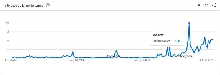 Olhando o interesse de busca dos brasileiros por Bolsonaro no Google – para o bem e para o mal – é possível identificar um mês importante para o parlamentar: abril de 2016. Neste mês, ele obteve um volume de buscas sem igual na história dele, mais brasileiros passaram a conhecê-lo. Se olharmos o gráfico acima, é possível ver que, desde 2004, o interesse era baixo e, após abril de 2016, ele foi alçado a outro patamar na política nacional.