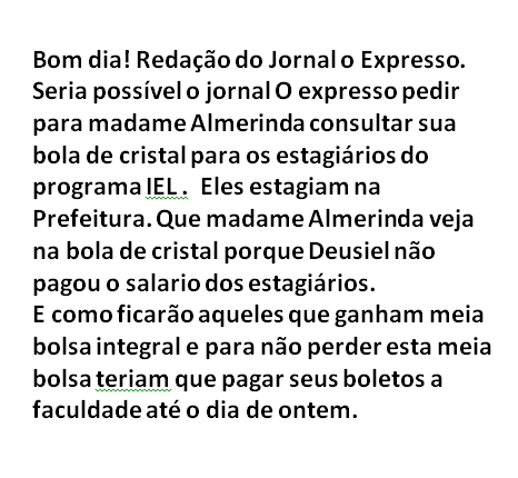 Recebemos a mensagem abaixo de um leitor, pedindo a intercessão de Madame Almerinda para o recebimento dos salários dos estagiários do IEL, que a Prefeitura esqueceu de pagar este mês.
