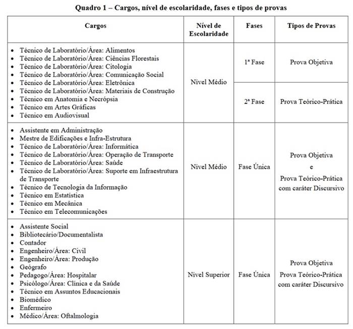 Confira a seguir o quadro com os cargos disponíveis e os tipos de provas que serão aplicados no certame.