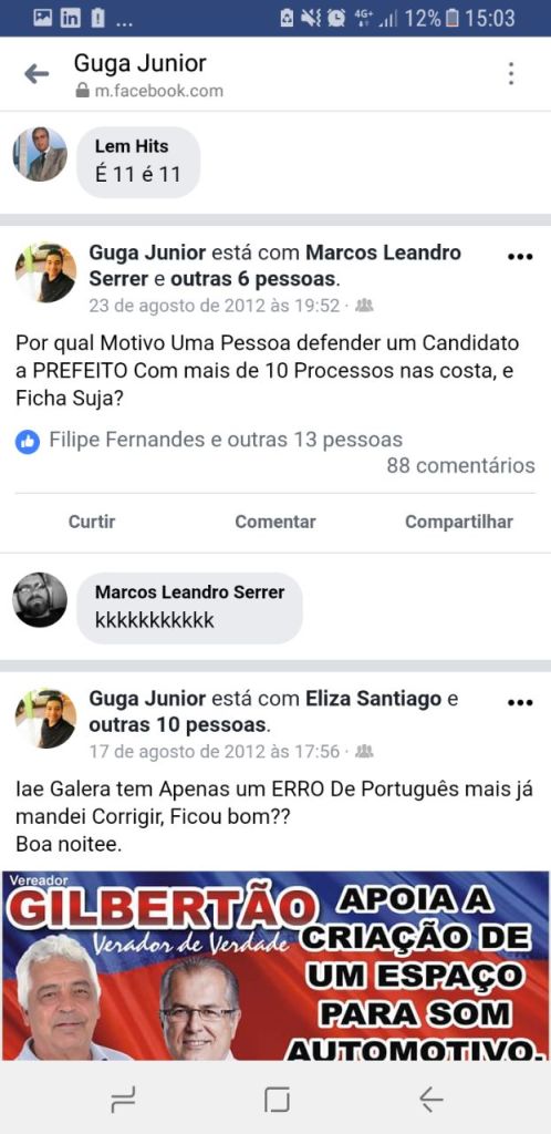 Há pouco mais de um ano, o indivíduo conhecido pelo nome de Guga Júnior era defensor do candidato de Humberto Santa Cruz. E falava horrores do atual prefeito, Oziel Oliveira, citando “seus 10 processos na Justiça” e o fato de estar enquadrado na chamada Lei da Ficha Limpa.